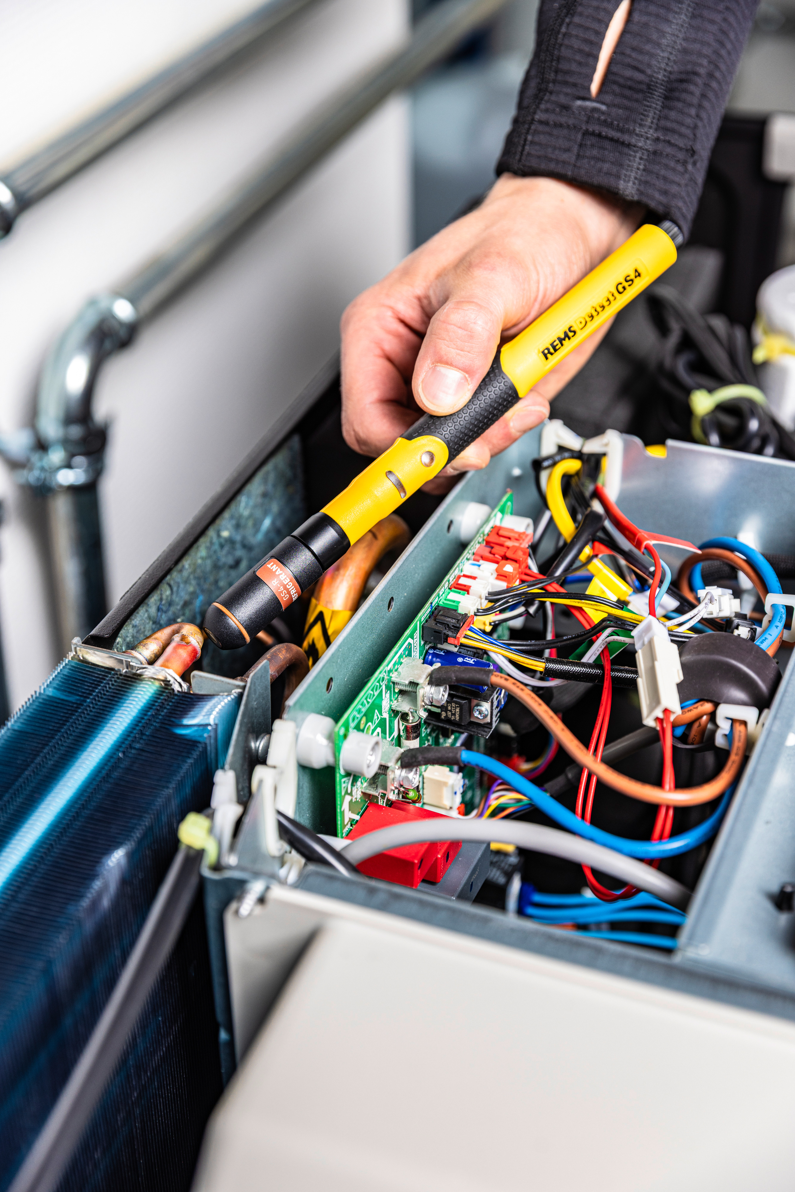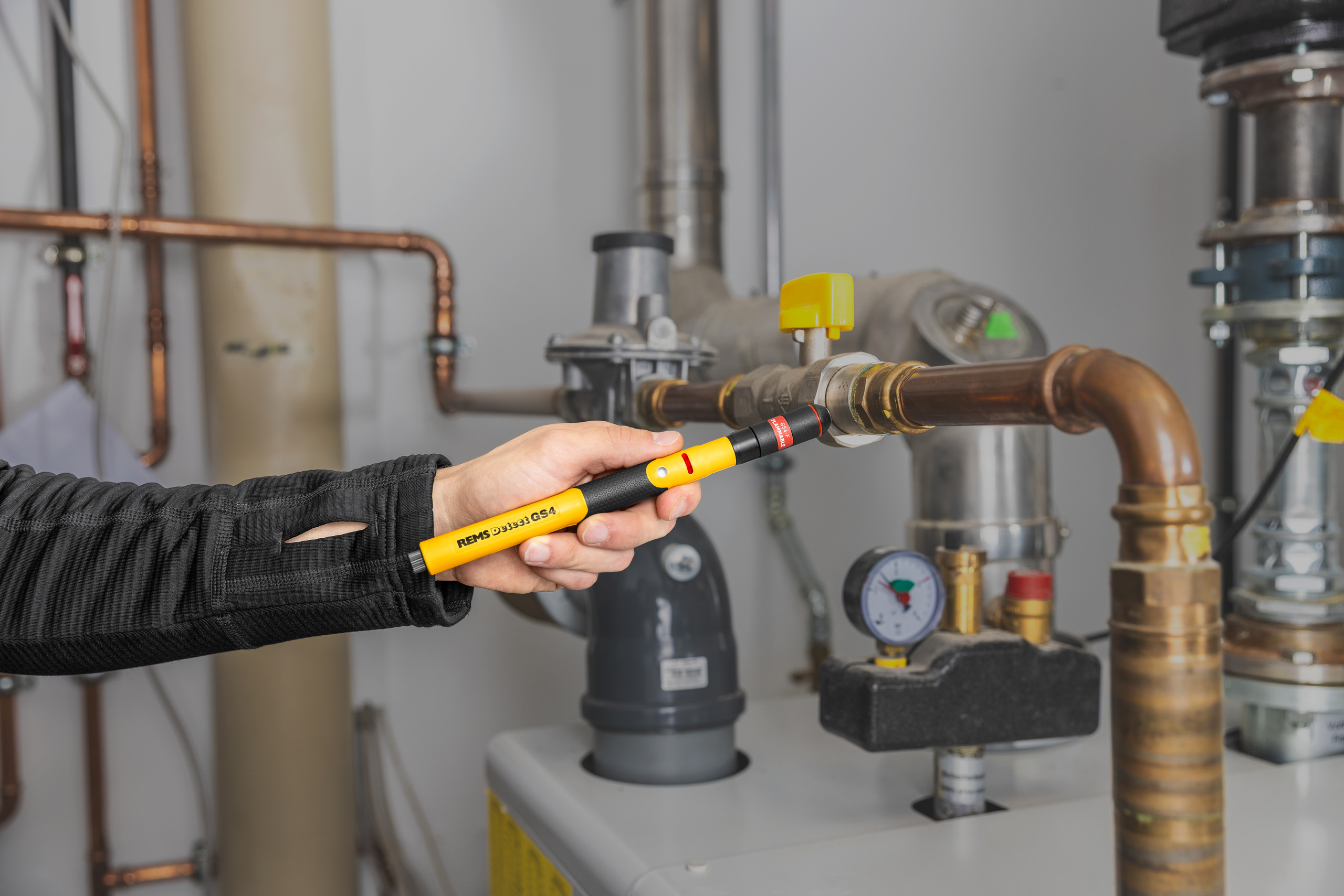 REMS Detect GS4 Set F. Die perfekte Lösung für zuverlässige Leckageortung. Superkleiner, superkompakter, elektronischer Leckagedetektor mit abnehmbarer, formbarer Verlängerung und wechselbaren Sensoren. Zur zuverlässigen Ortung unterschiedlicher Gasarten, z. B. Erdgas, Methan, Flüssiggas, Propan, Butan, Wasserstoff, Ammoniak und unterschiedlicher Kältemittelarten. Stabiles, schlagfestes Kunststoffgehäuse. Softgrip für sicheres, ergonomisches Arbeiten. Nur ein Taster zum Ein-/Ausschalten und manuellen Start der Einlaufphase. Nach dem Einschalten und bei gestecktem Sensor startet REMS Detect GS4 die Einlaufphase selbstständig. Zustandsanzeige mit 2 grünen LEDs: abwechselnd blinkend = Einlaufphase, beide durchgehend leuchtend = betriebsbereit. Mit optischem und akustischem Signal bei Veränderung der Gaskonzentration durch 3 farbige LEDs - gelb, orange, rot - und Frequenzerhöhung/-senkung des Signaltons. Formbare Verlängerung 200 mm, werkzeuglos abnehmbar. Für schwer zugängliche Stellen. Wechselsensoren zur Ortung unterschiedlicher Gas-/Kältemittelarten, z. B. brennbare Gase, Kältemittel, Ammoniak, Wasserstoff (Beschreibung siehe untenstehend). Mit Farbkodierung. Werkzeuglos steckbar direkt auf REMS Detect GS4 oder auf formbarer Verlängerung. Messprinzip: Halbleitersensor, Einlaufphase 15 - 150 s, Ansprechzeit ca. 2 s (bei hoher Konzentration). Wechselaufsatz GS4-LED, LED-Leuchte mit hoher Leuchtkraft. Deutsches Qualitätsprodukt. Elektronischer Leckagedetektor, formbare Verlängerung 200 mm, werkzeuglos abnehmbar, Wechselsensor GS4-F für brennbare Gase, 2 Batterien 1,5 V, AAA, LR3. Im stabilen Softbag.