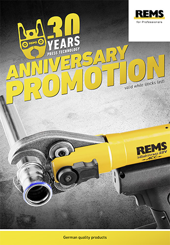 Universal, handy electric tool with automatic circuit control for making pipe pressing joints for all common pressfitting systems. Pressing joints Ø 10–108 mm / 3/8 - 4". Complete range of REMS pressing tongs/pressing rings for all common pressfitting systems.